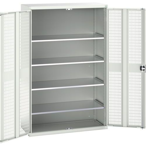 Fém műhelyszekrények drótajtókkal a jó szellőzés és a tartalom átláthatósága érdekében. A 75 kg teherbírású horganyzott polcok magassága 25 mm-es lépésekben állítható. Hegesztett acélszerkezet, porszórt felületkezelés. Hárompontos zárás hengereltolásos zár.
