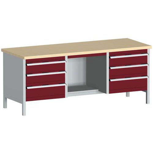 Műhelyasztal Bott Cubio Tároló, 84 x 200 x 75 cm, 6 fiók, polcok, multiplex, szürke-piros