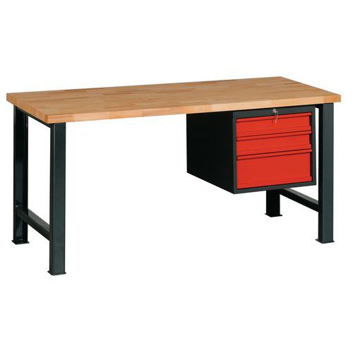 Weld munkapad két színváltozatban, munkalapból, szilárd lábazatból és szekrényből áll három fiókkal.