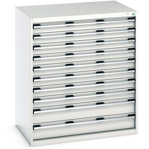 Bott Cubio fiókos szekrények 75 kg-os teherbírású, görgőscsapágyakon 100%-ban bővíthető fiókokkal. Magas hegesztett acélszerkezet, akár 1,5 tonna teherbírással, porszórt bevonattal. Központi zárrendszer és több nyitás blokkolása fiókok egyszerre. Ergonomikus fogantyúk feliratos szalaggal, zárás hengerzárral két kulccsal.