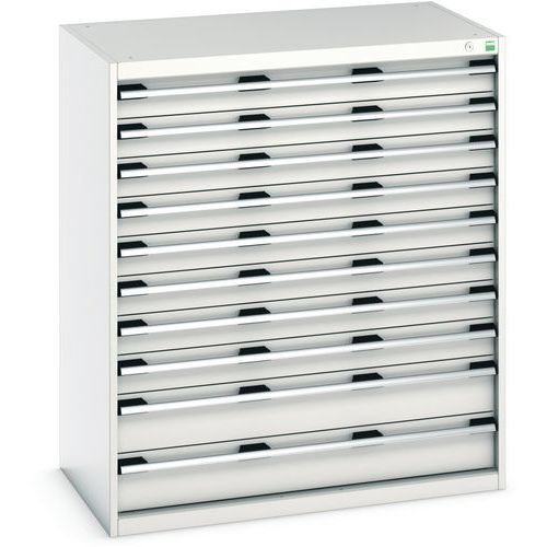 Bott Cubio fiókos szekrények 75 kg-os teherbírású, görgőscsapágyakon 100%-ban bővíthető fiókokkal. Magas hegesztett acélszerkezet, akár 1,5 tonna teherbírással, porszórt bevonattal. Központi zárrendszer és több nyitás blokkolása fiókok egyszerre. Ergonomikus fogantyúk feliratos szalaggal, zárás hengerzárral két kulccsal.