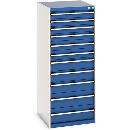 Bott Cubio fiókos szekrények 75 kg-os teherbírású, görgőscsapágyakon 100%-ban bővíthető fiókokkal. Magas hegesztett acélszerkezet, akár 1,5 tonna teherbírással, porszórt bevonattal. Központi zárrendszer és több nyitás blokkolása fiókok egyszerre. Ergonomikus fogantyúk feliratos szalaggal, zárás hengerzárral két kulccsal.