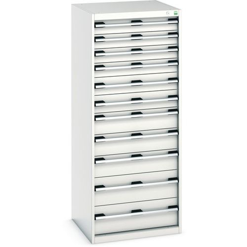Bott Cubio fiókos szekrények 75 kg-os teherbírású, görgőscsapágyakon 100%-ban bővíthető fiókokkal. Magas hegesztett acélszerkezet, akár 1,5 tonna teherbírással, porszórt bevonattal. Központi zárrendszer és több nyitás blokkolása fiókok egyszerre. Ergonomikus fogantyúk feliratos szalaggal, zárás hengerzárral két kulccsal.