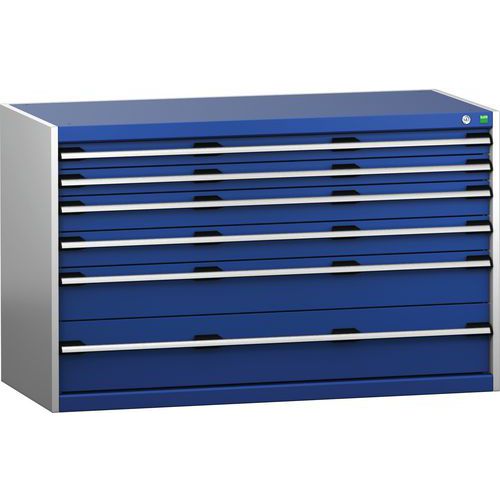 Bott Cubio fiókos szekrények 200 kg teherbírású fiókokkal és 100%-ban görgős csapágyakkal bővíthető. Magas hegesztett acél konstrukció 1,5 tonna teherbírásig, porszórt bevonattal. Központi zárrendszer és több nyitás blokkolása fiókok egyszerre. Ergonomikus fogantyúk feliratos szalaggal, zárás hengerzárral két kulccsal.