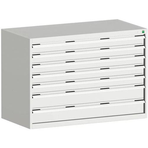 Bott Cubio fiókos szekrények 75 kg-os teherbírású, görgőscsapágyakon 100%-ban bővíthető fiókokkal. Magas hegesztett acélszerkezet, akár 1,5 tonna teherbírással, porszórt bevonattal. Központi zárrendszer és több nyitás blokkolása fiókok egyszerre. Ergonomikus fogantyúk feliratos szalaggal, zárás hengerzárral két kulccsal.