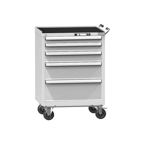 Fém műhelykocsik öt fiókkal. A felső polc gumibetéttel van felszerelve. A mobil konténer központi zár és fiókblokkoló mechanizmussal van felszerelve. Két fix és két forgó, fékezett, 125 mm átmérőjű kereket tartalmaz. Két fogantyú biztosítja a jobb kezelhetőséget. Három színváltozatban kapható.