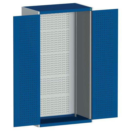 Hátsó fal perforált műanyag dobozok felakasztására és az ajtó belső oldala a szerszámtartók rögzítésére. Magas hegesztett acélszerkezet, 1,5 tonna teherbírásig, porszórt bevonattal. Megerősített lengőajtók, hengerzárral zárható két kulccsal. A szerszámtartókat a szállítás nem tartalmazza.