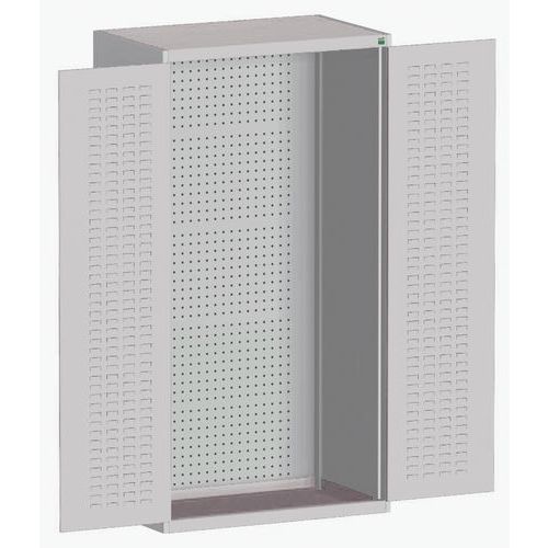 Hátsó fal perforációval a szerszámtartók rögzítéséhez és az ajtó belső oldala a műanyag dobozok felakasztásához. Magas hegesztett acélszerkezet, akár 1,5 tonna teherbírással, porszórt bevonattal. Megerősített lengőajtók, zárás hengerzárral, két kulccsal . Szerszámtartók ezek nem részei a szállításnak.