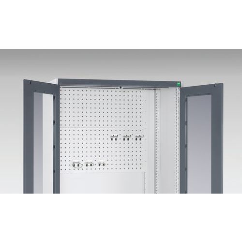 A hátsó fal és az ajtó belső oldala perforációkkal a szerszámtartók rögzítéséhez. Magas hegesztett acélszerkezet, akár 1,5 tonna teherbírással, porszórt bevonattal. Megerősített lengőajtók, két kulccsal zárható hengerzárral. Szerszám a tartókat a szállítás nem tartalmazza.
