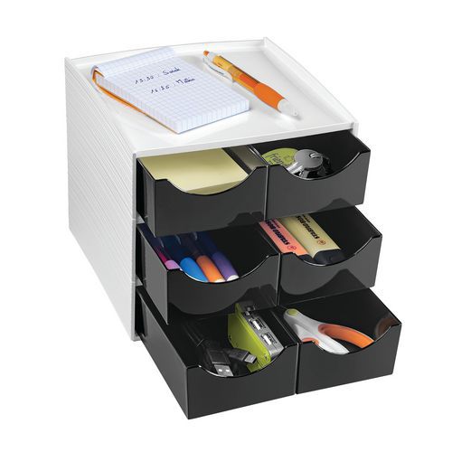 A MyCube mini tárolómodulok műanyagból készülnek. Ezek a modulok könnyen elférnek az asztalon, és segítenek összegyűjteni és tárolni az összes kisebb kiegészítőt és irodai kelléket. Az ergonomikus fogantyúk biztosítják a fiókok könnyű kinyitását. Az aljzatok végütközőkkel vannak ellátva, hogy megakadályozzák a kiesést, de szükség esetén könnyen eltávolíthatók a modulból.