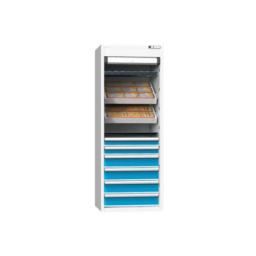 A szekrénytest világos szürke RAL 7035 színű, kerékzáras alumínium redőnnyel záródik. Az alapfelszereltség része a furatazonosító rendszer és az intelligens bútor funkcióval ellátott leírás. Lehetőség van ZD elrendezésű (36x27) fiókok a szekrényekbe akasztására.