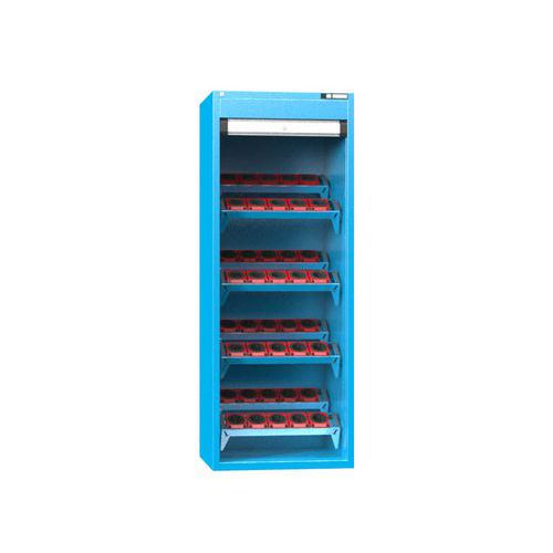A szekrénytest világos szürke RAL 7035 színű, kerékzáras alumínium redőnnyel záródik. Az alapfelszereltség része a furatazonosító rendszer és az okosbútor funkcióval ellátott címke. A szekrényekbe ZD (36x27) elrendezésű fiókok is felakaszthatók.