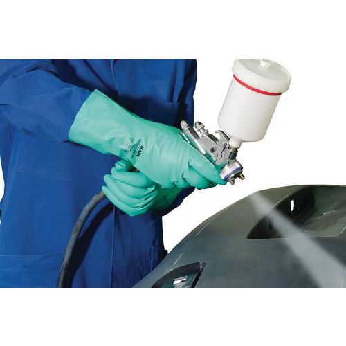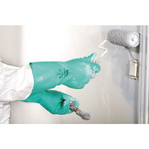 Vegyszerek kezelésére alkalmas kesztyű. Anatómiai forma és minőségi bélés gondoskodik a kézügyességről és a kényelemről. Kiváló mechanikai ellenállás (kopás, szúrás) biztosítja a termék hosszú élettartamát. A következő munkák elvégzésére használható: Mérnöki/autóipar. Fémek bevonása/zsírtalanítása oldószerekkel. Alkatrészek megmunkálása vágóolajjal. Helyi hatóságok (takarítás). Agresszív vegyszerek kezelése. Növénygondozás. Növény-egészségügyi kezelés. Építőipar (ácsok/asztalosok/kőművesek/vakolók). PVC alapú ragasztók kezelése. Festékek és lakkok előkészítése. Tömítőanyagok, oldószerek, tisztítószerek kezelése.