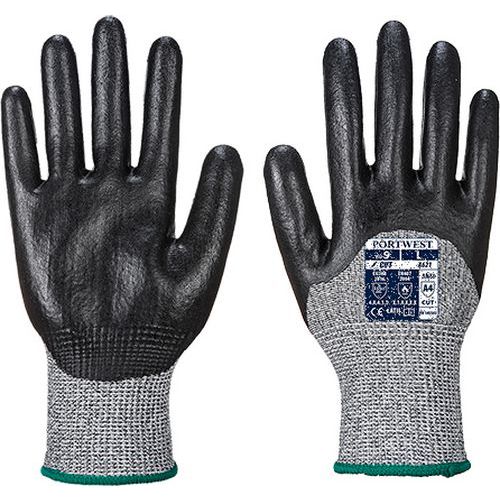 Magas vágásbiztosságot garantáló olajos munkakörnyezetben is használható habosított nitrillel bevont védőkesztyű. CE minősítés Kötési sűrűség 13 Kisker csomagolás 100% lélegző varratmentes bélés 3/4 mártott Kiváló kopásállóság és szakítószilárdság Nitril hab bevonat ANSI vágásbiztosság A3 szint D szintű vágásbiztosság