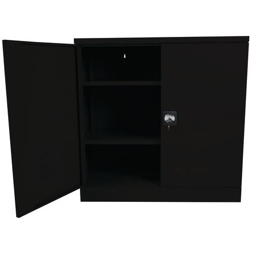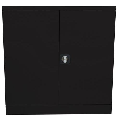 Alacsony fém szekrény mappák és dokumentumok tárolására. 180°-ban nyitható ajtószárnyakkal. Két polccal az áttekinthető rendszerezésért. A polcok maximális terhelhetősége egyenként 60 kg. A dokumentumok védelmét zár biztosítja. Gyorsan és egyszerűen, szerszámok nélkül összeszerelhető.