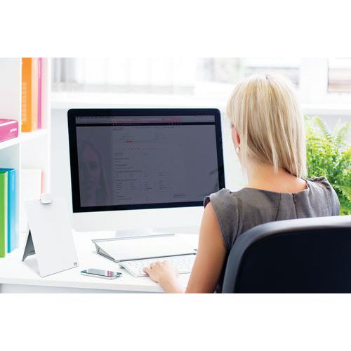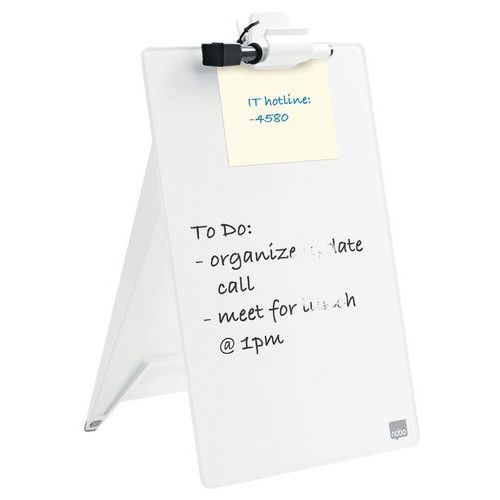 Designer íróasztali állvány. A keret nélküli, törölhető üvegfelület a legnagyobb ellenállást biztosítja a foltokkal és karcolásokkal szemben. Az edzett üveg felületre jegyzeteket is rögzíthet, vagy csipesszel dokumentumokat állíthat ki.