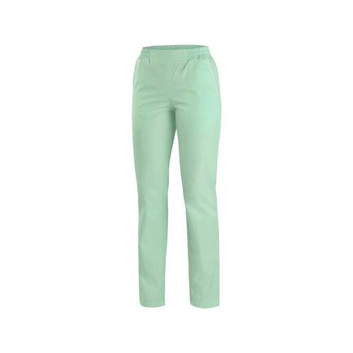 Kényelmes szabású női nadrág kontrasztos fehér csíkozással, elasztikus derékkal, 2 elülső zsebbel. Felhasználási javaslat: magán rendelők, klinikák és nagy egészségügyi intézmények, sürgősségi és egészségügyi közlekedési szolgáltatások, gyógyfürdő létesítmények, szociális ellátó intézmények Méret: 36-60 Külső anyag: 62% pamut 35% poliészter 3% elasztán Szín: zöld