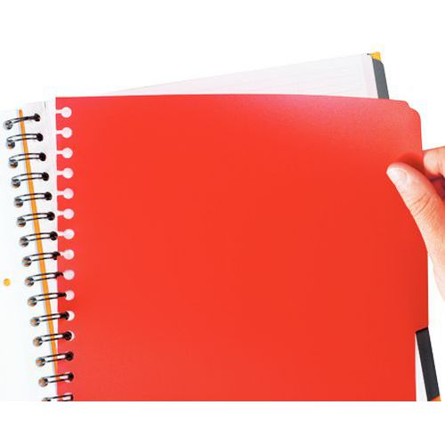 Spirálkötésű jegyzetfüzetek a jegyzetek áttekinthető rendezéséhez. Négy lapszakaszt tartalmaz, különböző színű élekkel és három pozícionálható elválasztót az egyszerű rendszerezés érdekében. A lyukasztott és kivehető lapok gyűrűs iratgyűjtőbe helyezhetők. Beépített zseb CD-k vagy dokumentumok tárolására. Erős és tartós laminált burkolat kemény táblákkal.
