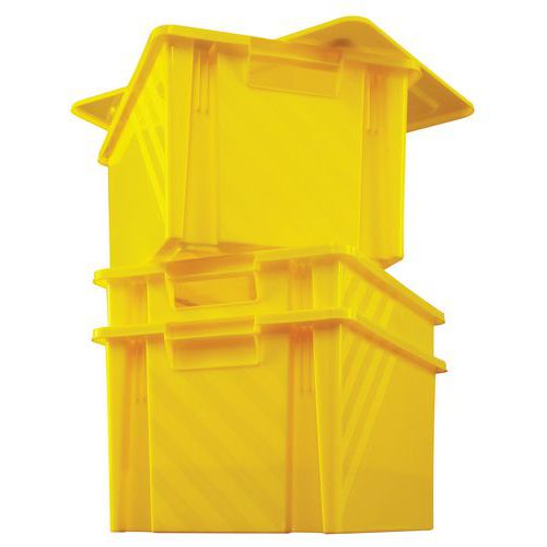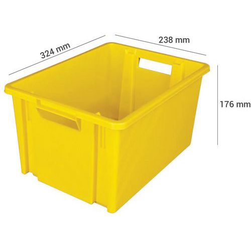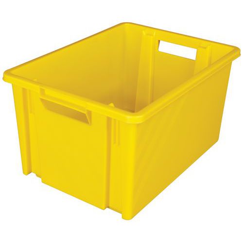 Egymásra rakható tartály fogantyúkkal a könnyű kezelés érdekében. Nagy ellenállás a mechanikai és kémiai hatásokkal szemben. Egymásra rakás lehetősége. Megerősített falak a nagyobb szilárdság érdekében.