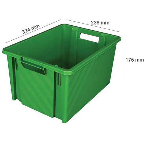 Egymásra rakható tartály fogantyúkkal a könnyű kezelés érdekében. Nagy ellenállás a mechanikai és kémiai hatásokkal szemben. Egymásra rakás lehetősége. Megerősített falak a nagyobb szilárdság érdekében.
