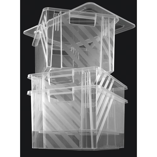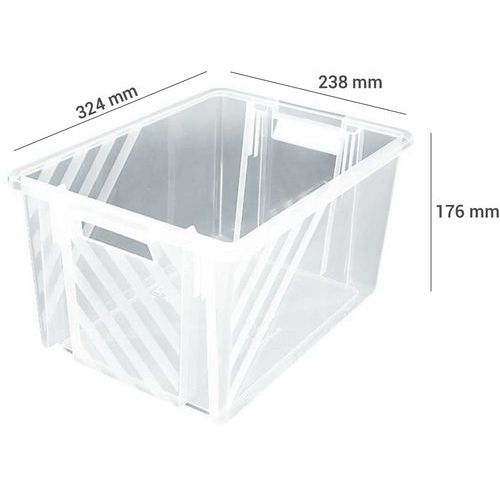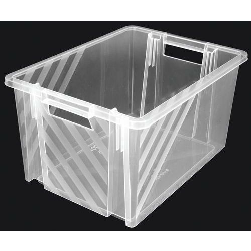 Egymásra rakható tartály fogantyúkkal a könnyű kezelés érdekében. Nagy ellenállás a mechanikai és kémiai hatásokkal szemben. Egymásra rakás lehetősége. Megerősített falak a nagyobb szilárdság érdekében.