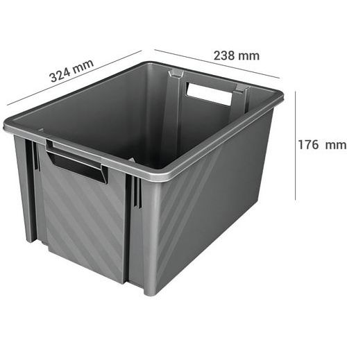 Egymásra rakható tartály fogantyúkkal a könnyű kezelés érdekében. Nagy ellenállás a mechanikai és kémiai hatásokkal szemben. Egymásra rakás lehetősége. Megerősített falak a nagyobb szilárdság érdekében.