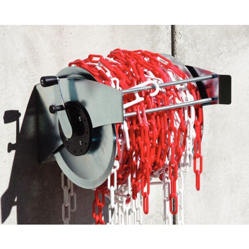 Sorompó láncelemekkel az optimális láthatóság érdekében. Átmenetileg kijelöli a korlátozott hozzáférésű területeket. Falra szerelhető, vagy kampós oszlopra rögzíthető.