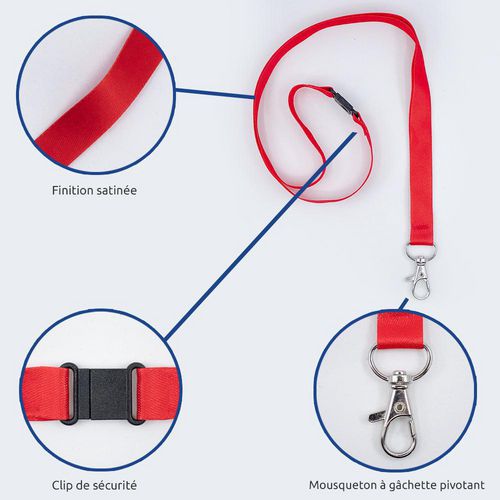 Újrahasznosított műanyag palackokból készült zsinórok. Sík szövetzsinór szatén bevonattal, kényelmes viselet. Fém forgókampó karabinerrel. Biztonsági kapocs a zsinór kioldásához túlzott feszültség esetén.