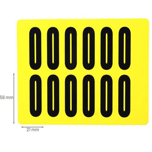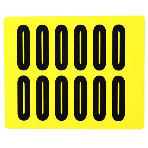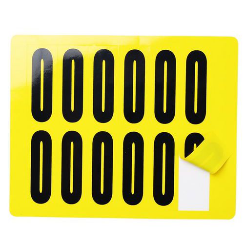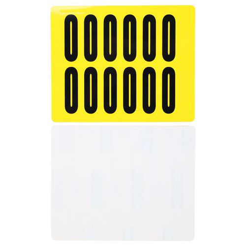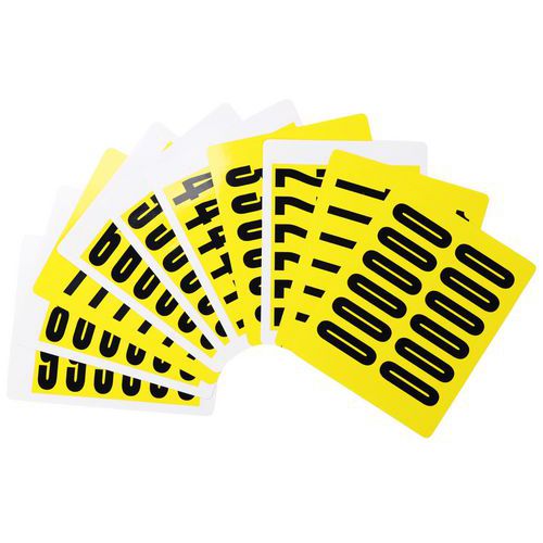 A vinilből készült, fekete számjegyeket sárga alapon nyolc különböző méretben szállítjuk. Tíz különböző számjegy 0-tól 9-ig nagyon jól látható, és egyszerűen alkalmazható. Levételkor nem hagynak nyomot. Használhatók irodában, raktárakban és gyártóüzemekben. A csomagolás 10 ívet tartalmaz, a címkék mennyisége a címkemérettől függően változik. kivitel típusa: öntapadós színe: sárga anyaga: műanyag címkék száma az ívben: 1 - 168 csomagolás: 10 ív