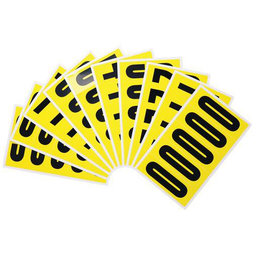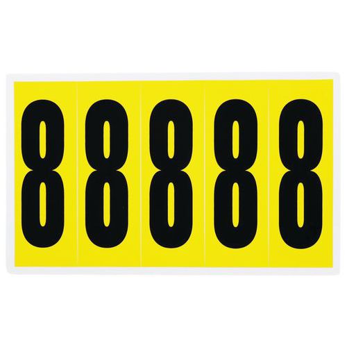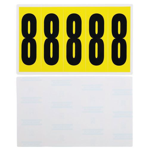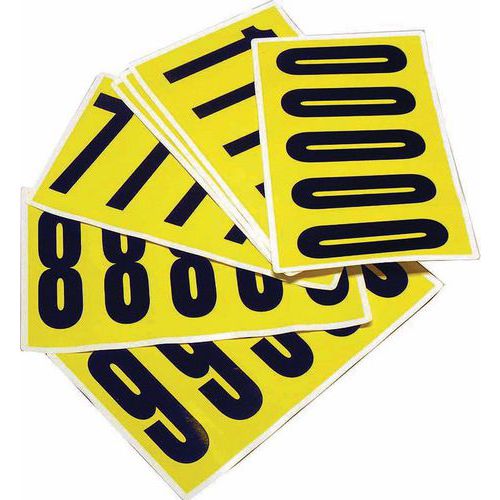 A vinilből készült, fekete számjegyeket sárga alapon nyolc különböző méretben szállítjuk. Tíz különböző számjegy 0-tól 9-ig nagyon jól látható, és egyszerűen alkalmazható. Levételkor nem hagynak nyomot. Használhatók irodában, raktárakban és gyártóüzemekben. A csomagolás 10 ívet tartalmaz, a címkék mennyisége a címkemérettől függően változik. kivitel típusa: öntapadós színe: sárga anyaga: műanyag címkék száma az ívben: 1 - 168 csomagolás: 10 ív