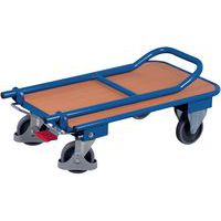 Összecsukható fogantyúval ellátott platós kocsik MDF lapból készült ágy. Rakodási magasság 265 mm. 2 fix és 2 forgó kerék EasySTOP fékkel. Szürke, nyommentes, termoplasztikus gumi kerekek műanyag felnin, precíziós golyóscsapágyakkal. Vázfelület-kezelés RAL skála szerinti porfestékkel. Ütés- és karcálló. Az EasySTOP központi fékrendszer mindkét forgó kereket bármilyen helyzetben rögzíti a pedál egyszerű megnyomásával. A pedál működtetéséhez nincs szükség munkavédelmi lábbelire vagy védőlábbelire.