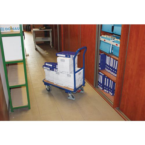 Összecsukható fogantyúval ellátott platós kocsik MDF lapból készült ágy. Rakodási magasság 265 mm. 2 fix és 2 forgó kerék EasySTOP fékkel. Szürke, nyommentes, termoplasztikus gumi kerekek műanyag felnin, precíziós golyóscsapágyakkal. Vázfelület-kezelés RAL skála szerinti porfestékkel. Ütés- és karcálló. Az EasySTOP központi fékrendszer mindkét forgó kereket bármilyen helyzetben rögzíti a pedál egyszerű megnyomásával. A pedál működtetéséhez nincs szükség munkavédelmi lábbelire vagy védőlábbelire. Teherbírás (kg) : 250 kg