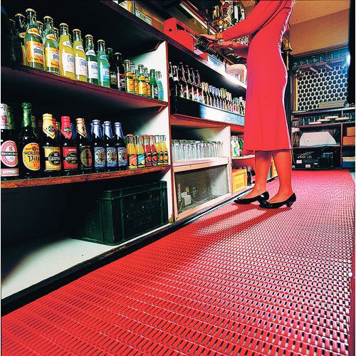 Környezetbarát PVC szőnyegek. Biztonságos a csúszásmentes domborításnak köszönhetően. Puha és könnyű, nagyon könnyen kihajtható. Könnyen tisztítható kefével és vízsugárral. Ellenáll az olajokkal és savakkal szemben Lábtörlő felhasználása : Közepes