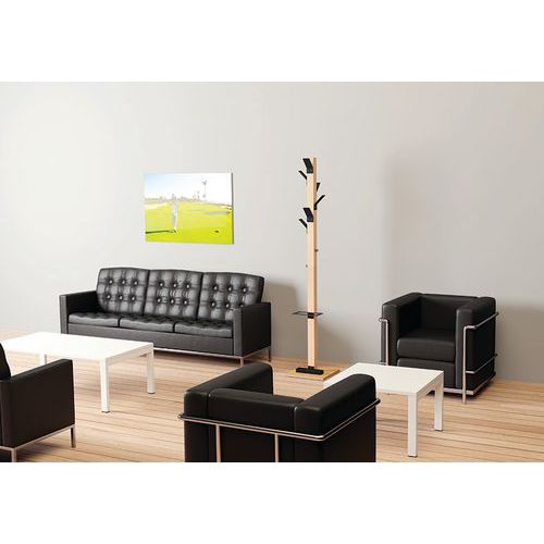 Hat ütésálló műanyag ruhaakasztó. Két krómozott acél kampó a tartozékokhoz. Tömör bükk oszlop 6 x 6 mm. Rétegelt lemez alap 35 cm x 35 cm, vastagság 2 mm.