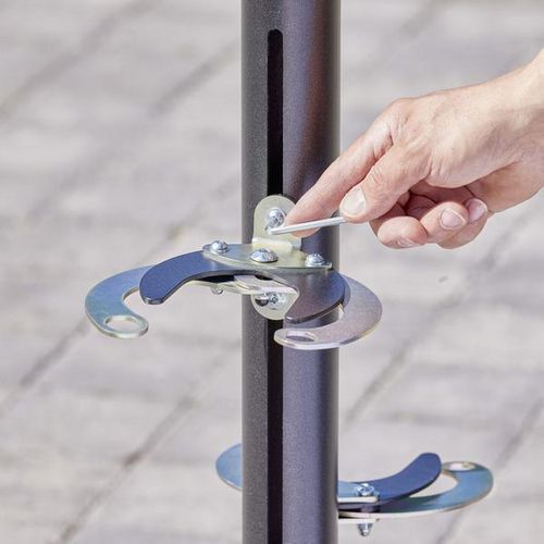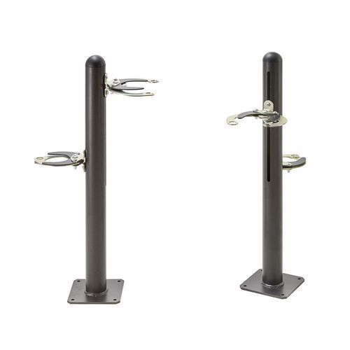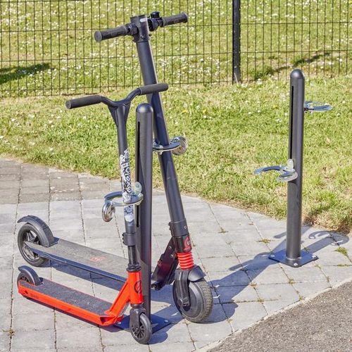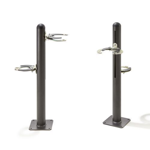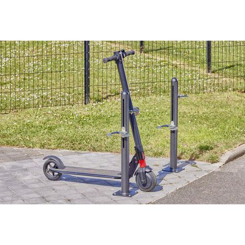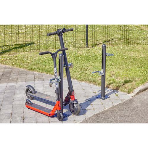 Parkolóoszlop 2 robogó számára. Lakattal, lánccal vagy U-zárral zárható (nem tartozék). Maximum 70 mm átmérőjű robogót rögzíthet. A biztonsági bilincsek magassága 37-66 cm között fokozatmentesen állítható bármilyen típusú robogóhoz. A bilincs magassága állítható Ø 4 mm-es TR kulccsal. Az állvány acélcsőből készül, fekete RAL 7021 epoxi porszórt bevonattal. Az alap 15 x 15 cm-es négyzet alakú lemez, 10 mm-es csavarlyukakkal.