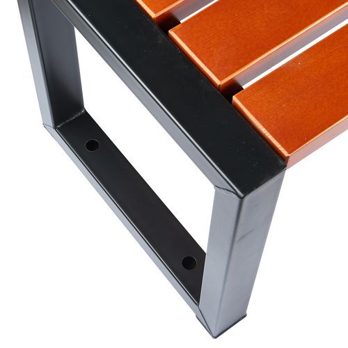 Egyenes kültéri pad városba, játszótérre vagy parkba. Stabil, robusztus kivitelű acélszerkezet. A szerkezet fekete porszórással felületkezelt. Lucfenyő lécek színezett festéssel. A pad csavarokkal a talajhoz rögzíthető.