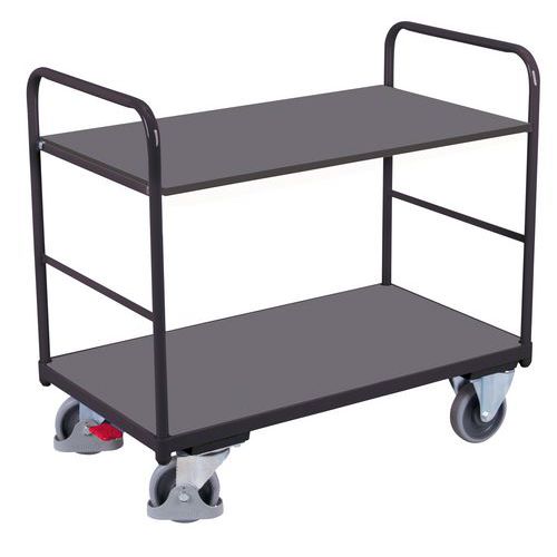 Két polcos polcos kocsik raktárba, anyagok és áruk szállítására. Az MDF lapokból készült polcok a felső polc fölé emelkedő fémszerkezetre vannak rögzítve, és fogantyúként is szolgálnak. A mozgást négy gördülő golyóscsapágyas kerék biztosítja, melyek közül kettő fix, kettő pedig Easy Stop fékekkel és védőburkolatokkal forgatható. Keret felületkezelés porfestékkel RAL skála szerint. Nem elkenődésmentes, hőre lágyuló gumi kerekek műanyag peremen, golyóscsapágyakkal, összegabalyodás- és lábvédővel. Az EasySTOP központi fékrendszer a pedál egyszerű megnyomásával bármely helyzetben rögzíti mindkét forgó kereket. A pedál működtetéséhez nincs szükség munka- vagy biztonsági lábbelire.