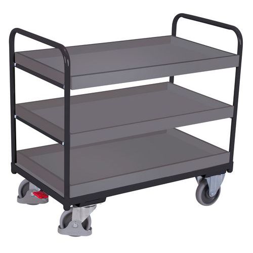 Raktári anyagok és áruk szállítására alkalmas rakodókocsik három polccal. Az MDF lapokból készült polcok a felső polc fölé emelkedő fémszerkezetre vannak rögzítve, és fogantyúként is szolgálnak. Minden polc 6 cm magas éllel van ellátva. A mozgást négy gördülő golyóscsapágyas kerék biztosítja, melyek közül kettő fix, kettő pedig Easy Stop fékekkel és védőburkolatokkal forgatható. Keret felületkezelés porfestékkel RAL skála szerint. Nem elkenődésmentes, hőre lágyuló gumi kerekek műanyag peremen, golyóscsapágyakkal, összegabalyodás- és lábvédővel. Az EasySTOP központi fékrendszer a pedál egyszerű megnyomásával bármely helyzetben rögzíti mindkét forgó kereket. A pedál működtetéséhez nincs szükség munka- vagy biztonsági lábbelire.