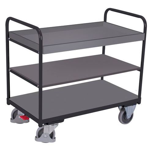 Rakodókocsik három polccal, alkalmasak anyagok és áruk szállítására. Az MDF lapokból készült polcok a felső polc fölé emelkedő fémszerkezetre vannak rögzítve, és fogantyúként is szolgálnak. A felső polc 6 cm magas éllel van ellátva. A mozgást négy gördülő golyóscsapágyas kerék biztosítja, melyek közül kettő fix, kettő pedig Easy Stop fékekkel és védőburkolatokkal forgatható. Keret felületkezelés porfestékkel RAL skála szerint. Nem elkenődésmentes, hőre lágyuló gumi kerekek műanyag peremen, golyóscsapágyakkal, összegabalyodás- és lábvédővel. Az EasySTOP központi fékrendszer a pedál egyszerű megnyomásával bármely helyzetben rögzíti mindkét forgó kereket. A pedál működtetéséhez nincs szükség munka- vagy biztonsági lábbelire.