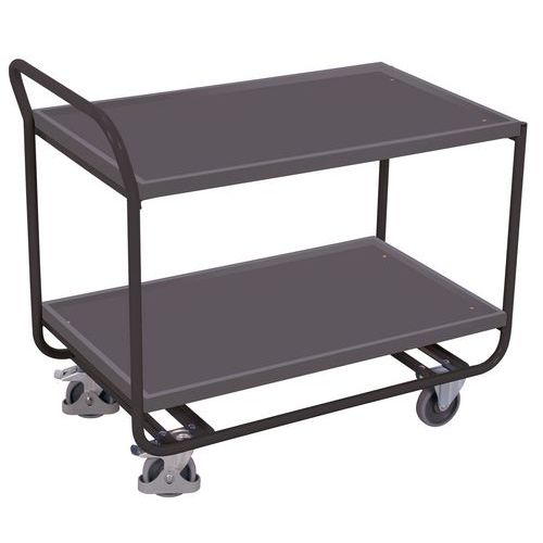 Polcos kocsi két MDF polccal, 17 mm-es emelt éllel. A mozgást két fix és két forgó, fékezett kerék biztosítja. Keret felületkezelés porfestékkel RAL skála szerint. Nem elkenődésmentes, hőre lágyuló gumi kerekek műanyag peremen, golyóscsapágyakkal, összegabalyodás- és lábvédővel.