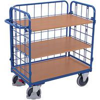 Három polcos polcos kocsik raktárba, anyagok és áruk szállítására. Az MDF lapból készült polcok magassága 12 cm-es lépésekben állítható, az alsó polc fix. A kocsik három oldalán rácsos oldalakkal vannak felszerelve, 12 x 12 cm-es hálószemekkel. A mobilitást négy gördülő golyóscsapágyas kerék biztosítja, amelyek közül kettő fix, kettő pedig Easy Stop fékekkel és védőburkolatokkal forgatható. Keret felületkezelés porfestékkel RAL skála szerint. Nem elkenődésmentes, hőre lágyuló gumi kerekek műanyag peremen, golyóscsapágyakkal, összegabalyodás- és lábvédővel. Az EasySTOP központi fékrendszer a pedál egyszerű megnyomásával bármely helyzetben rögzíti mindkét forgó kereket. A pedál működtetéséhez nincs szükség munka- vagy biztonsági lábbelire.