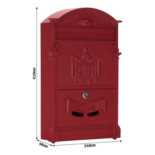 Dekoratív postaláda történelmi kialakítással. Előlap akár A4-es méretig, alul zárható ajtó a posta kivételéhez. Címke névtábla számára. A doboz időjárásálló, beltéren és kültéren egyaránt használható. A postaláda hátulján lyukak vannak a falra szereléshez. Hengeres zár 2 kulccsal.