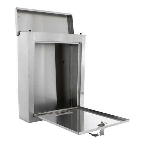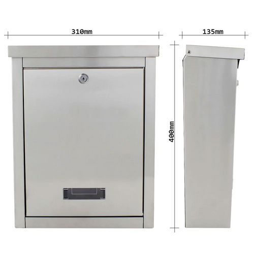 Rozsdamentes acélból készült fém levélszekrények. Felső nyílás legfeljebb A4-es méretű borítékok számára. Címke névtábla számára. Zárható elülső ajtó a postai küldemények könnyű eltávolításához. A postaládák időjárásállóak, beltéren és kültéren egyaránt használhatóak. Előfúrt lyukak a hátoldalon a falra szereléshez. Hengeres zár 2 kulccsal.