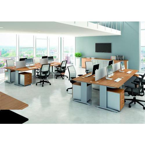 Íróasztalok egyszerű és praktikus formatervvel, L alakú fém lábazattal. Az oldalfalak lehetővé teszik a kábelek rejtett vezetését. A fém részek porlakkal kezeltek. Az asztallábak szintkiegyenlítő csavarokkal vannak ellátva a padló enyhe egyenetlenségeinek kiegyenlítésére. Az asztalok nem rendelkeznek kábelvezető nyílásokkal.