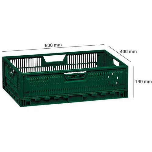 Gyorsan és egyszerűen összecsukható és szétnyitható. Összehajtható ládák, amelyek egymásra rakhatók és raklapokon tárolhatók szabványos európai termékekkel. Könnyen tisztítható a rejtett mélyedések nélküli kialakításnak köszönhetően. A belső falak élelmiszerrel érintkezve kezelve. A tartalom egyszerű azonosítása 2 címketartóval. Gyártói garancia az ügyfélnek : 3 év Max. terhelés (kg) : 20 kg