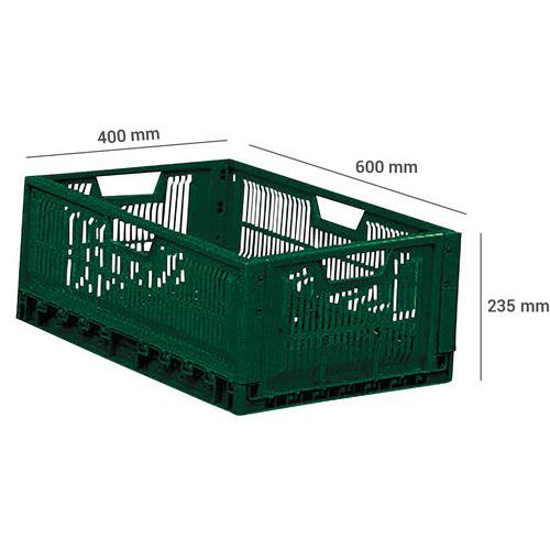 Gyorsan és egyszerűen összecsukható és szétnyitható. Összehajtható ládák, amelyek egymásra rakhatók és raklapokon tárolhatók szabványos európai termékekkel. Könnyen tisztítható a rejtett mélyedések nélküli kialakításnak köszönhetően. A belső falak élelmiszerrel érintkezve kezelve. A tartalom egyszerű azonosítása 2 címketartóval. Gyártói garancia az ügyfélnek : 3 év Max. terhelés (kg) : 20 kg