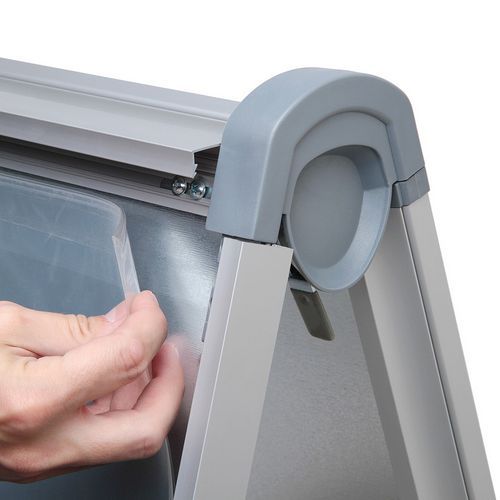 A kétoldalas A alakú állványok alkalmasak szórólapok, fényképek, plakátok, speciális ajánlatok stb. bemutatására. A reklámtáblák karral összehajtható védő mechanizmusokkal rendelkeznek. Az állványok hátoldala fém, szilikon tömítéssel a peremén a masszívabb keretért, aminek köszönhetően ütésállók. Az UV szűrős védőfóliás táblák tartósabbá teszik a plakátot és megakadályozzák annak kifakulását. Az állványok kiváló stabilitással rendelkeznek a levágott műanyag lábvégződéseknek köszönhetően.