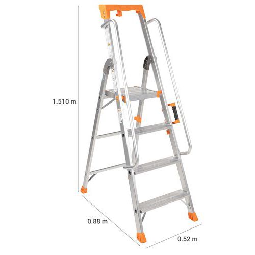 Professzionális alumínium létrák. Többcélú műanyag polcot tartalmaz szerszámhoroggal. Mindkét oldalon kapaszkodó a fokozott biztonság érdekében. Megerősített alumínium keret. Csúszásgátló lábak. Könnyen szállítható és tárolható. Gyártói garancia az ügyfélnek : 10 év Max. terhelés (kg) : 150 kg