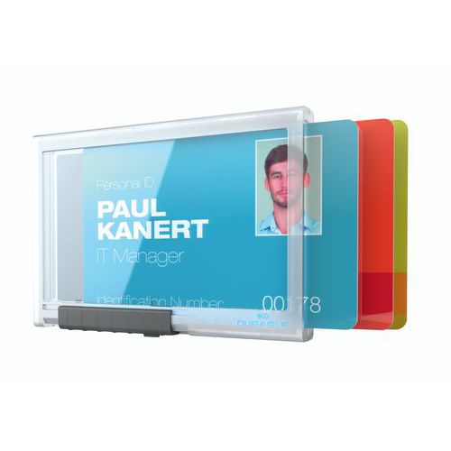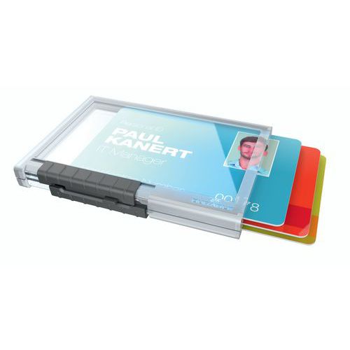 Kemény tok 1-3 biztonsági belépéshez, 54 x 87 mm. Minőségi átlátszó műanyag. A kártyák teljesen a rekeszben maradnak, és nem csúsznak ki. Külön rekeszek védik személyes RFID- vagy mágneskártyáit. Nyomógomb az egyes kártyák egyszerű eltávolításához kártya. Vízszintes vagy függőleges helyzetben