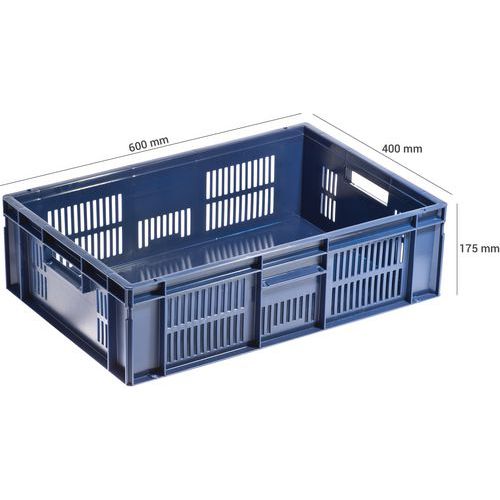 Rakásolható polipropilén szállítórekeszek tömör fenékkel és perforált oldalfalakkal, kompatibilis az EUR-raklappal. Nyitott markolat a könnyű kezelésért. Nagyfokú stabilitás rakásolhatóságnál. Ellenáll az olajoknak, zsíroknak és számos vegyszertípusnak. Alkalmas különböző környezetbe és éghajlati viszonyok közé (például élelmiszeripar).